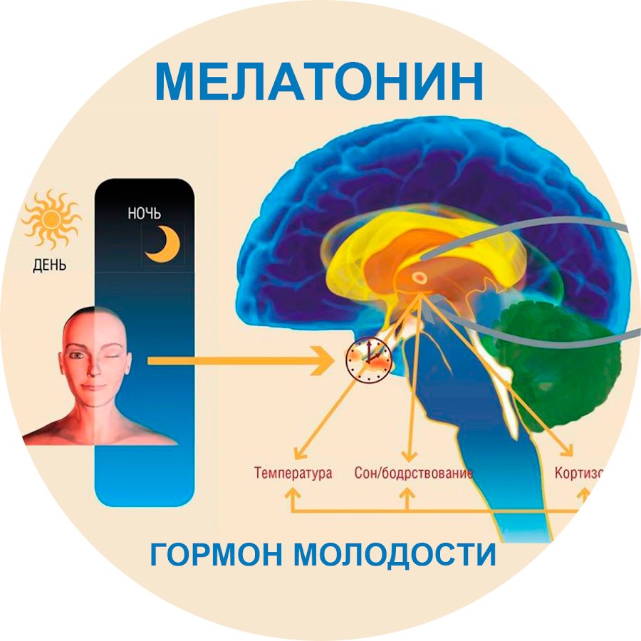 Мелатонин — это гормон, который вырабатывается в основном в тёмное время суток в шишковидной железе головного мозга — эпифизе, когда человек крепко спит. Секреция продолжается 8–10 часов, но пиковый выброс происходит в 3–4 утра.