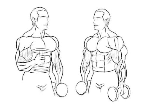 Напрягайте бицепсы, поднимая гантели к плечам. Локти в неподвижном состоянии по бокам корпуса, не выводите их вперед; - Когда кисть достигнет верха груди, фиксируем положение 1 секунду, напрягаем мышцу бицепса еще сильнее. Медленно опускаем снаряды и выдыхаем.